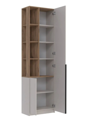 Шкаф-пенал имеет 4 открытых полки, на которых можно разместить декор, цветы, игрушки. Также стеллаж оборудован 2 распашными дверцами: за маленькой находится 2 полки для хранения во всю длину, за большой кроме этих 2 полок еще 4 полки для хранения.