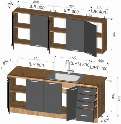 Габариты кухни 2000 мм (ШхВхГ): Шкаф верхний: 800х705х300 мм Шкаф верхний (стекло): 800х705х300 мм Шкаф верхний: 400х705х300 мм Шкаф нижний: 800х830х450 мм Шкаф нижний (мойка): 800х830х450 мм Шкаф нижний (с ящиками): 400х830х450 мм