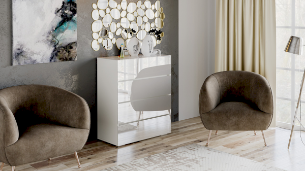 Каркасные детали выполнены из ЛДСП, которая устойчива к истиранию и имеет антистатический эффект, что позволит замедлить оседание пыли на поверхность мебели. Фасады ящиков и крышка тумбы выполнены из ЛДСП с закаленным глянцевым стеклом, что придает им неповторимую изысканность и утонченность.